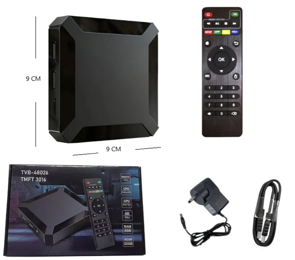 TV Box Android 10.0. Cuenta con procesador ARM Cortex A53 Quad Core, 4GB de RAM y almacenamiento de 32GB o 64GB. Soporta WiFi 2.4G, DLNA, Full HD y 4K para una reproducción fluida. Incluye control remoto, cable HDMI, adaptador y manual.