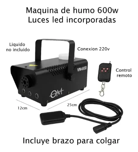 Incluye: Máquina de humo OM-600 Control remoto inalámbrico Manual de uso Uso recomendado: Perfecta para fiestas, boliches, shows, bares, escenarios, estudios de foto y ambientaciones especiales.
