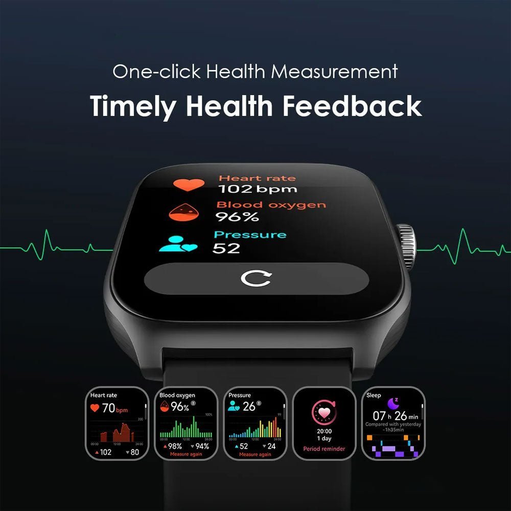 Watch Nova AM cuenta con monitoreo de salud con un solo clic para frecuencia cardíaca, oxígeno en sangre y más, brindando información de datos oportuna y accesible.