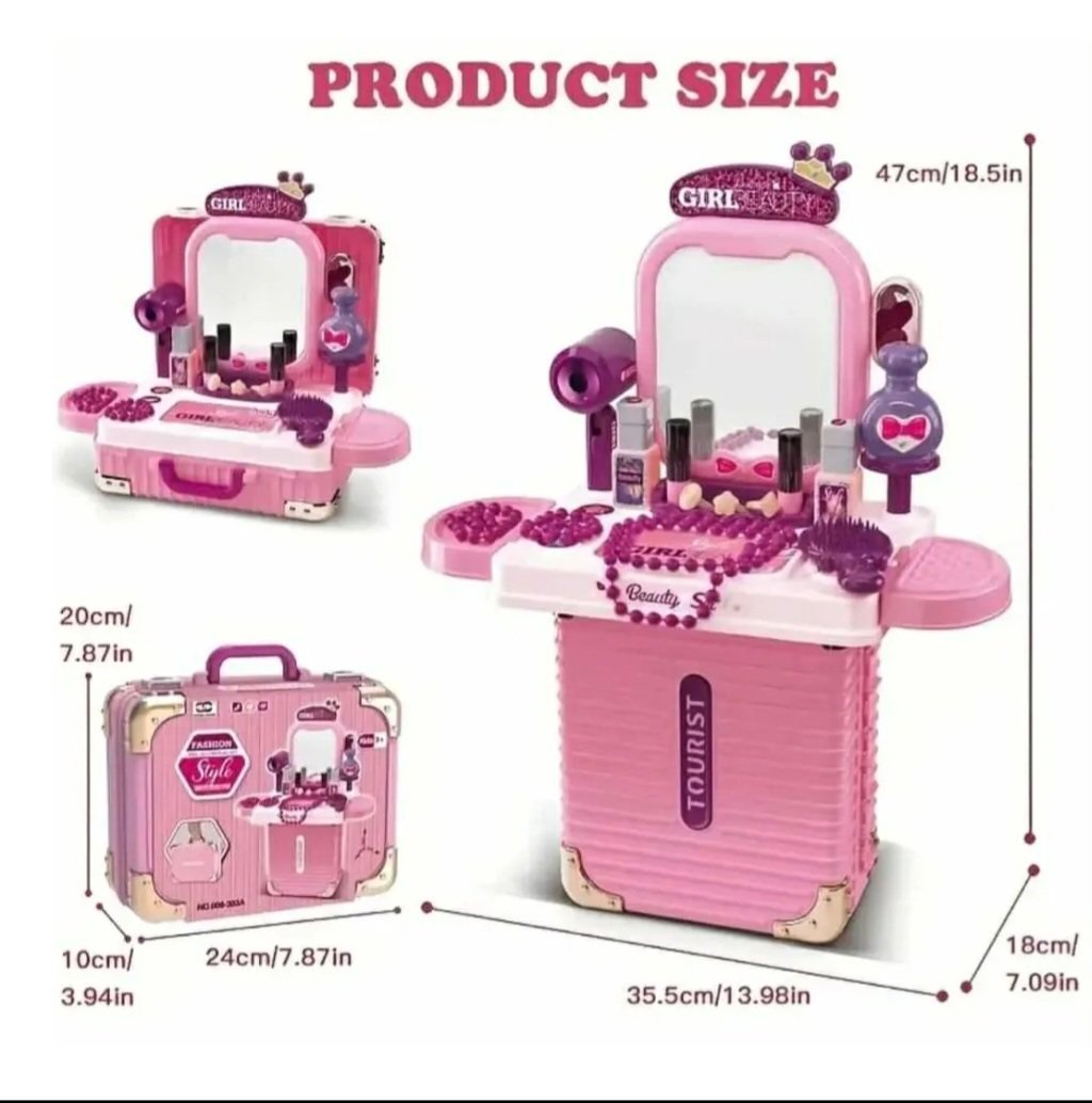 Incluye accesorios de belleza como espejo, peines, frascos, maquillajes y complementos de fantasía que estimulan la imaginación, el juego de roles y la creatividad. Ideal para que las niñas imiten rutinas, inventen personajes y desarrollen su expresión personal 💕